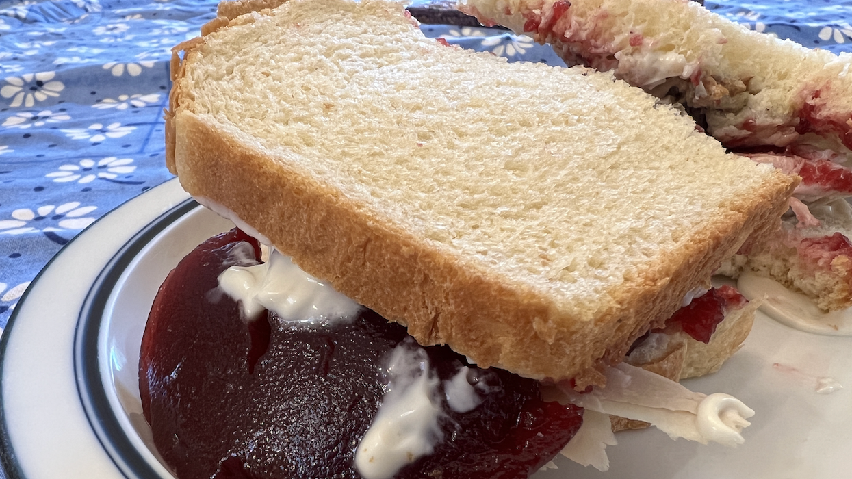 He then tells us to mix our leftover cranberries with mayo — to prevent things from getting soggy — and then spread the mixture on the toasted bread. (Oh, got any herbs on hand? They're good for that cranberry-mayo spread too.)