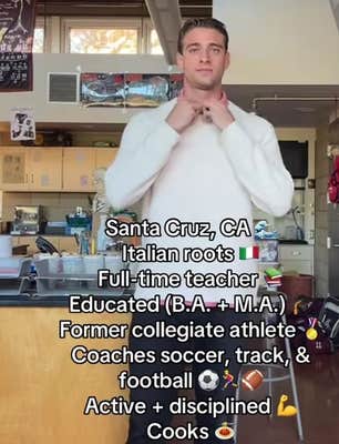 Jacob Myers-Norys (@yacobmyers) usually posts Instagram content based on his job as a teacher in Santa Cruz, CA. Recently, he shifted gears and shared a list of facts about himself—from Italian roots to the fact that he cooks—in hopes of finding love.
