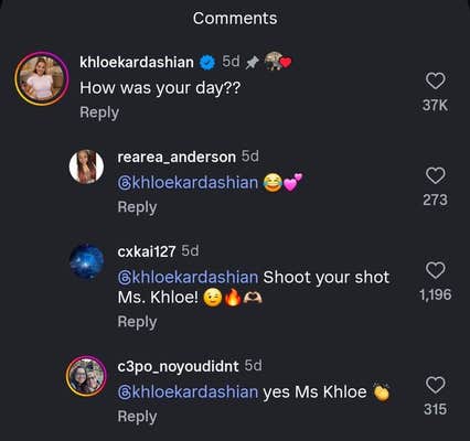 His post went viral, and it wasn't long before Khloe popped into the comments, pointedly writing, "How was your day??"