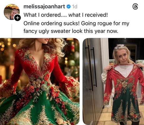 Actress Melissa Joan Hart faced some teasing from AI-savvy commenters after an online shop misrepresented its merchandise. The Sabrina the Teenage Witch star (1990s version) posted a comparison between what she expected vs. what she got on Instagram, and fans had little sympathy to offer.