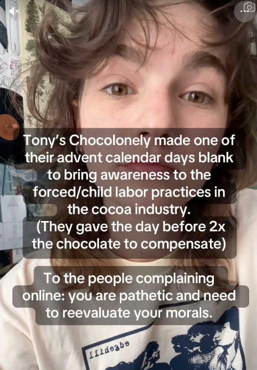 One thing worth noting is that Tony's wasn't trying to trick people here. A listing for the advent calendar still up on World Market clearly states that one of the spaces is empty and why. The company has also offered the same calendar in past years, and repeatedly reaffirms that their entire reason for existence is to draw attention to exploitation in the chocolate industry.