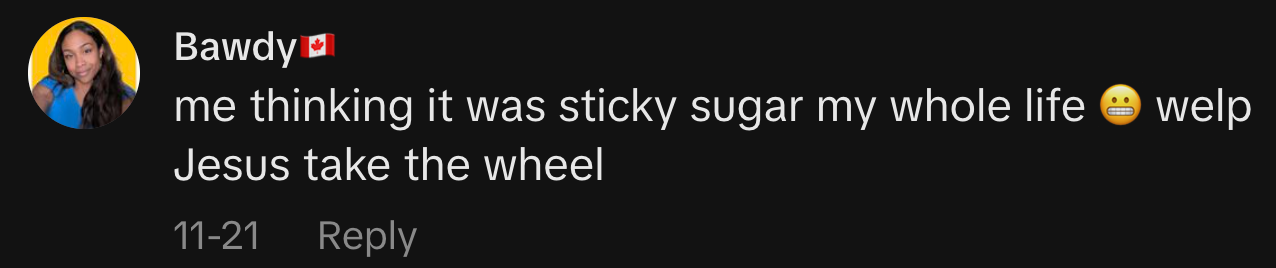 “me thinking it was sticky sugar my whole life 😬 welp Jesus take the wheel”