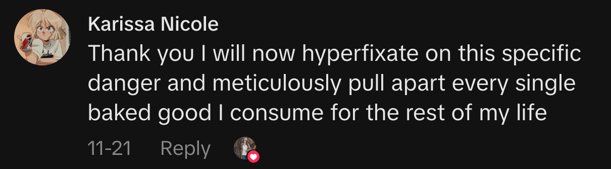 “Thank you I will now hyperfixate on this specific danger and meticulously pull apart every single baked good I consume for the rest of my life,” one commenter wrote.