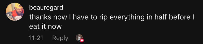 “Thanks now I have to rip everything in half before I eat it now,” wrote another.