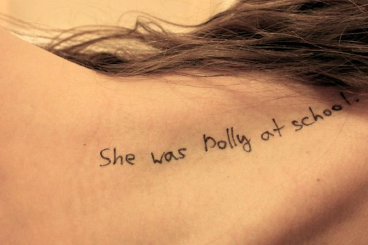 "Lo-lee-ta: the tip of the tongue taking a trip of three steps down the palate to tap, at three, on the teeth," reads ink writing on a female chest in one photo, quoting Vladimir Nabokov's novel "Lolita." There is no indication whether the individual is a survivor, or whether or not she was an adult when the photos were taken.