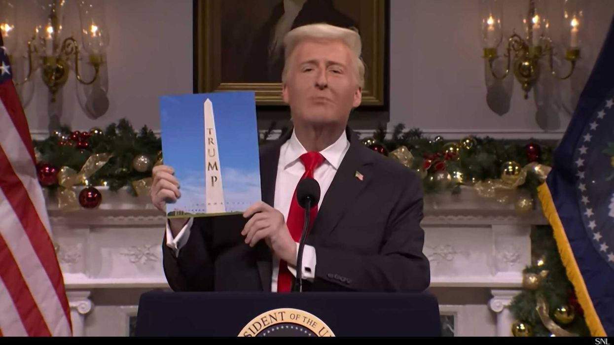 Addressing the nation, James Austin Johnson's Trump character discussed upcoming plans to add his name to additional buildings. After unveiling the "Trump Washington Monument," he said, "People are saying, 'Sir, why are you putting your names on so many buildings?"