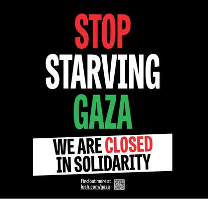 "One thing Lush can currently send into Gaza is our love and a strong message that we stand in solidarity," the statement reads. "This will take the form of halting business-as-usual by shutting our shops, website, and factories in the UK for one day...with our shop windows displaying the message STOP STARVING GAZA – WE ARE CLOSED IN SOLIDARITY."