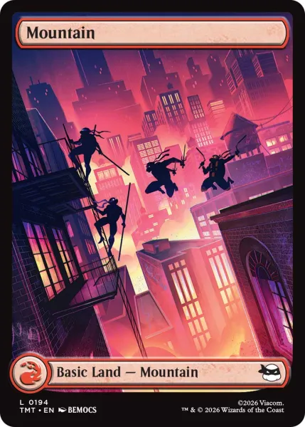 In the Vanish Lands pictured below, you can see that these basic land cards showcase various places around New York City, the metropolis the Turtles have always called home. However, if you look closer at the scenes, you'll see remnants of the Turtles – that's because these scenes showcase parts of NYC where the Turtles were just at, disappearing into the night to be heroes, according to Frasier. In the full-art Rooftop Lands, pictured in the gallery below, you'll see the Turtles' silhouettes as they leap from rooftop to rooftop, inspired by various TMNT media.