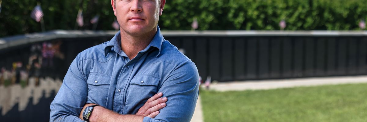 The protester, Brian McGinnis, is a Marine Corps veteran. He is a citizen, exercising his First Amendment rights.